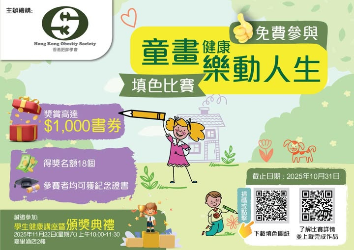 香港肥胖學會一直致力提升社會對肥胖問題的認識,並在全港社區及學校推行外展教育活動。今年,學會特別舉辦了「童畫健康.樂動人生」填色比賽,邀請全港幼稚園及小學生發揮創意,從小培養健康生活習慣。