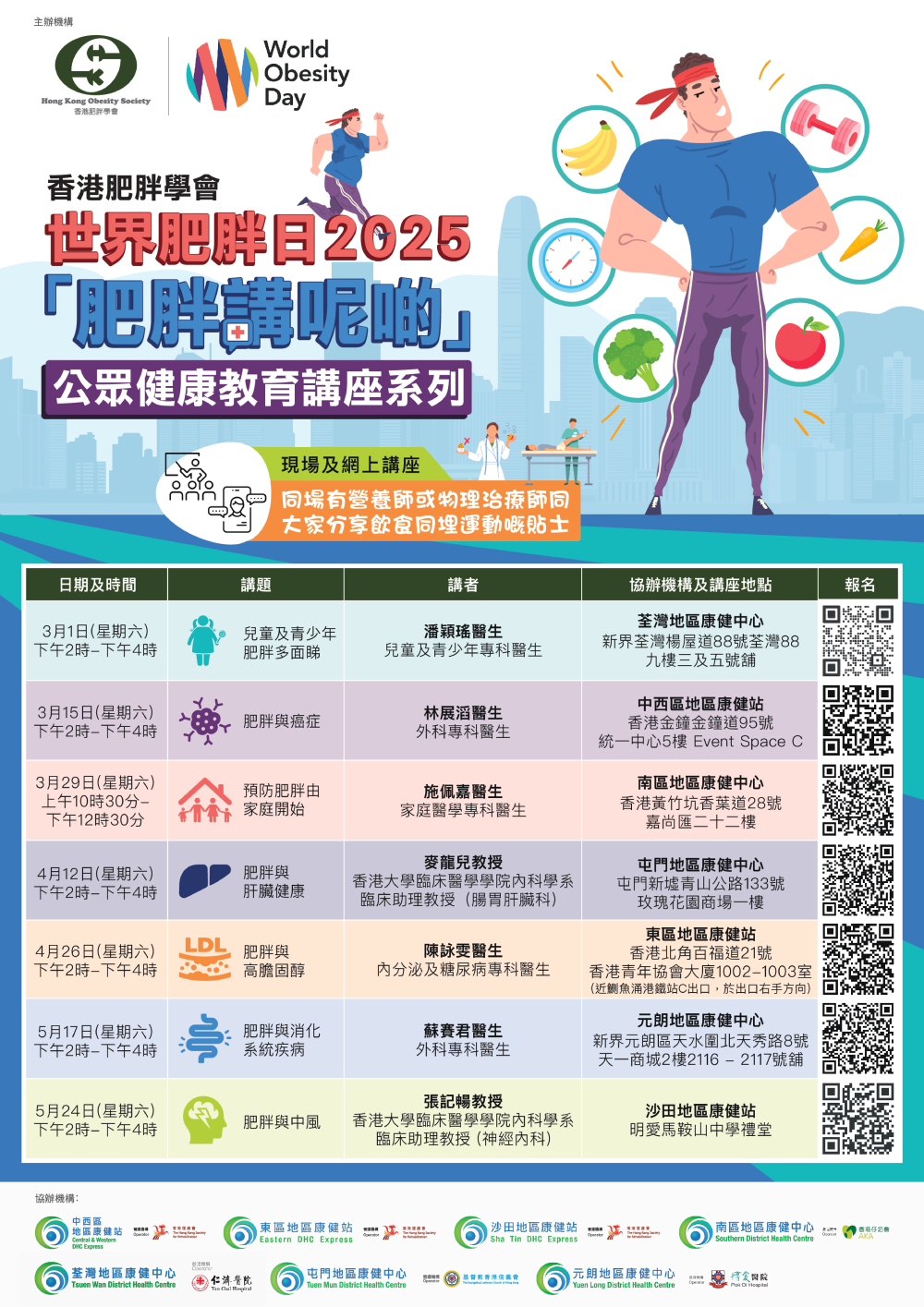 今年我哋好高興同各大地區康健中心/地區康健站合辦「世界肥胖日2025 - 肥胖講呢啲」健康教育講座系列。我哋邀請咗唔同範疇嘅專科醫生/學者為大家講解肥胖症對身體唔同器官嘅影響,尤其係腸胃,肝臟,中風及癌症方面。